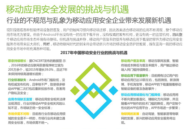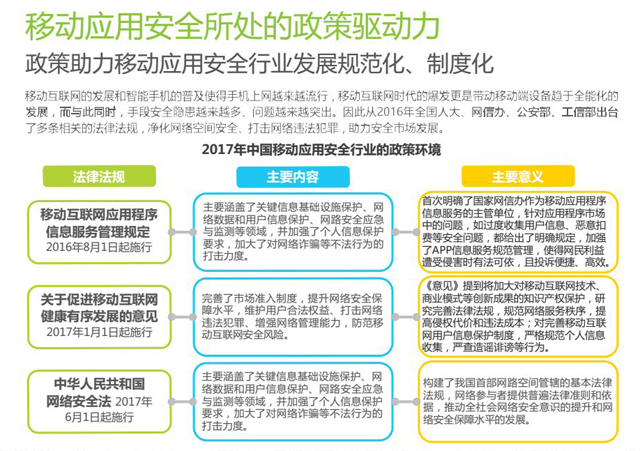 互联网+时代的到来,手机网民占全国网民的95%以上。热门行业Top10的移动应用基本存在高危漏洞,移动应用市场上89%的热门应用存在仿冒。在严峻安全形势下,国家发布了《网络安全法》、《移动互联网应用程序信息服务管理规定》等对网络应用的建设者进行责任划分。